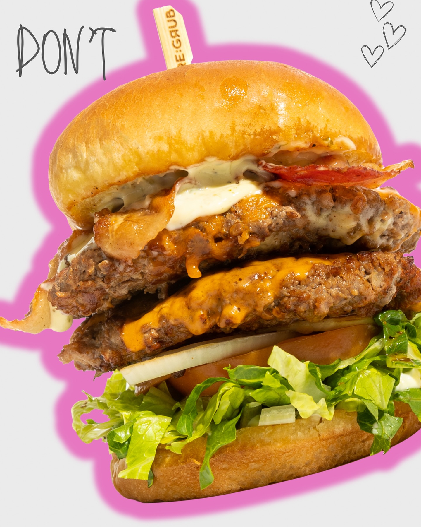 Two Brisket Patties, Bacon, Cheddar Cheese, White Onion, Tomato, Lettuce, Cheeky Sauce.
