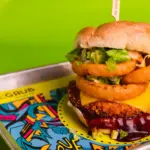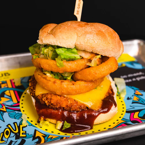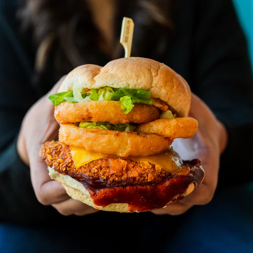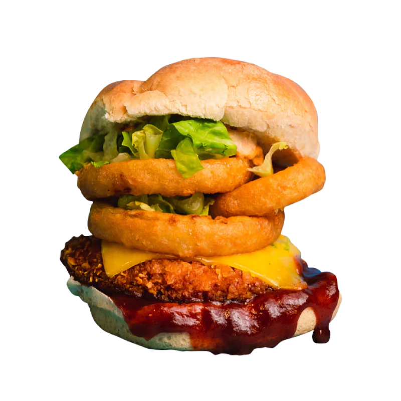 DEEP-FRIED Jackfruit Patty served with Onion Rings, Vegan Cheddar Cheeze, Lettuce, Vegan Spicy Aioli and Vegan BBQ Sauce